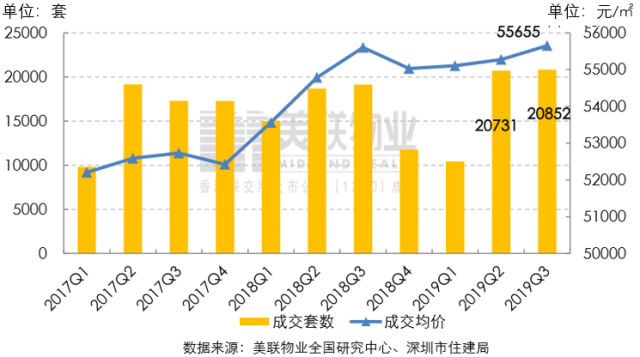 2019年第三季度二手住宅市場延續第二季度成交熱度,共備案20852套二手住宅,再創三年來季度成交量新高,較今年第二季度上升0.6%,同比去年第三季度上升8.9%;總成交面積約173.80萬㎡。美聯物業(深圳)藍籌住宅價格方面,今年第三季度全市二手住宅的成交均價為55655元/㎡,較第二季度上漲0.7%,同比去年第三季度上漲0.1%。