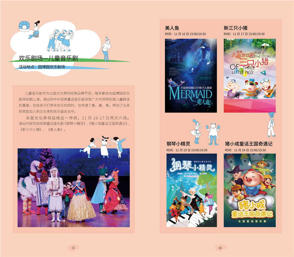 兒童音樂劇是公園文化季的經典品牌節目。11月16日、17日每天3場兒童音樂劇在園博園歡樂劇場舉行,表演中外經典童話音樂劇。