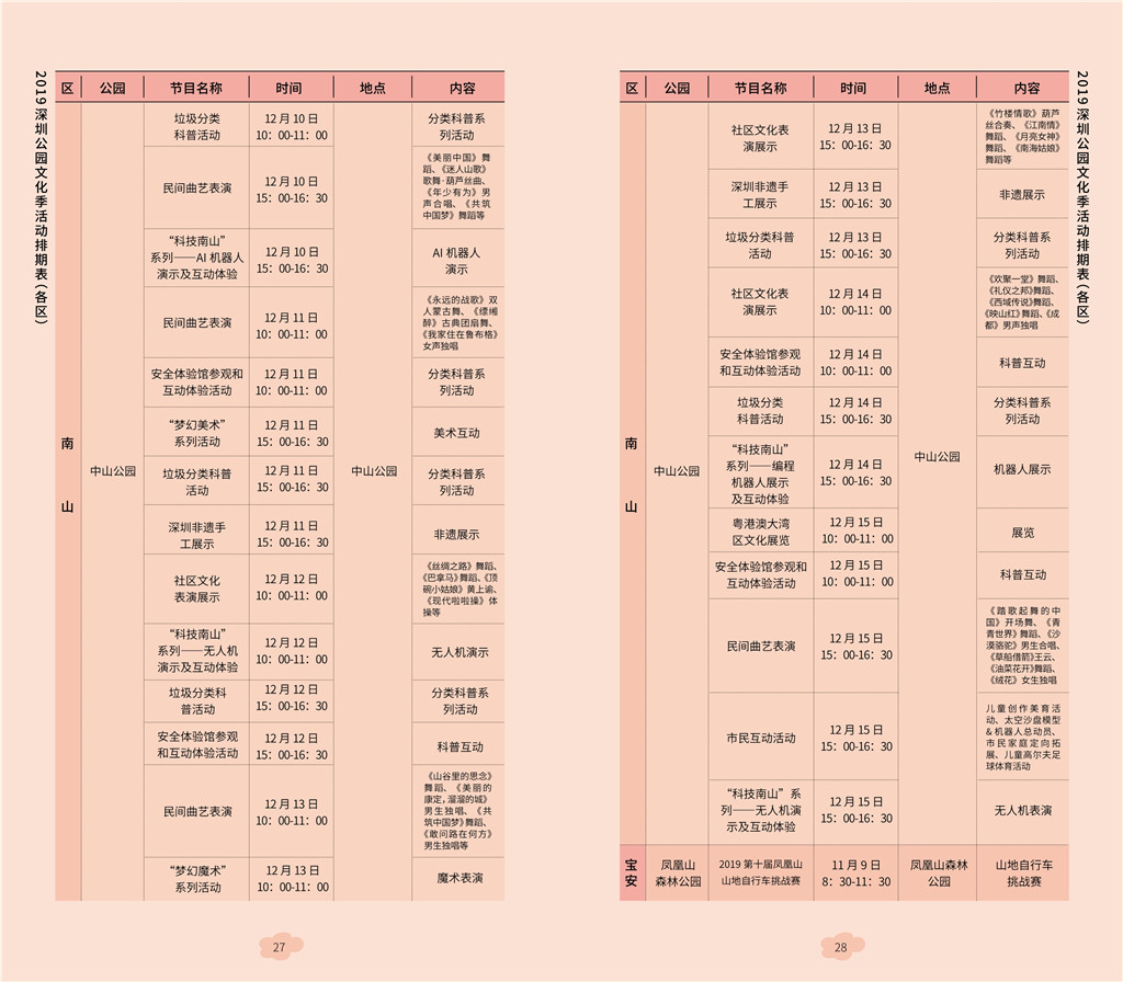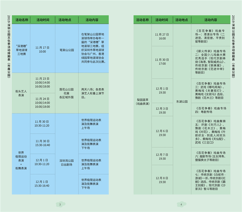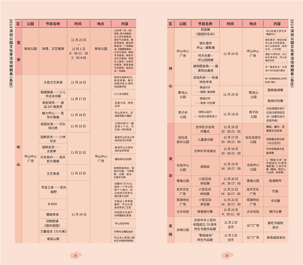 記者了解到,11月8日,2019深圳公園文化季將正式啟幕,持續至12月8日,為期一個月。舉辦地點包括蓮花山公園、深圳灣公園、園博園、東湖公園、中心公園、筆架山公園、皇崗公園等7個市屬公園和22個區屬公園。其中,市屬公園重點活動將集中在周末舉行,為廣大市民帶來精彩紛呈的公園文化盛宴。