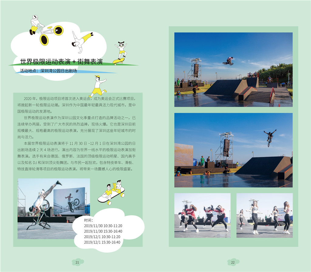 相比往年,今年既有年輕人熱衷的草地音樂會、街舞表演,針對青少年的網球、足球公開賽,又有兒童愛看的童話音樂劇,還有老年人喜愛的戲曲專場等等,活動節目覆蓋各個年齡段。例如,今年的深圳灣草地音樂會由中央民族樂團、廣州交響樂團、深圳交響樂團坐鎮表演,既突出民族特色,又有粵港澳和國際元素;世界極限運動由來自多國的頂級運動明星帶來表演。此外,還有多項首次開展的活動,例如,首屆自然教育嘉年華、新增街頭藝人表演等,契合深圳創意之都的特點,彰顯深圳的包容與多元。