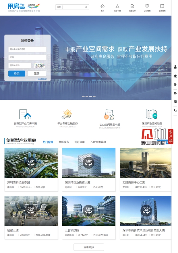 記者在平臺官網看到,平臺不僅提供創新型產業用房申請入口、平臺專享金融服務、企業空間需求申報,還設有深圳產業空間地圖、720度全景看房,頁面簡潔直觀。