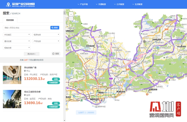 深圳產業空間地圖相當直觀實用,哪個區有合適的產業用房房源一目了然。