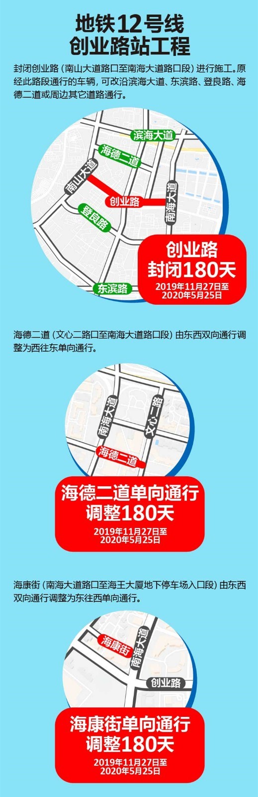 (一)2019年11月27日至2020年5月25日共180天,封閉創業路(南山大道路口至南海大道路口段)進行施工。原經此路段通行的車輛,可改沿濱海大道、東濱路、登良路、海德二道或周邊其它道路通行。