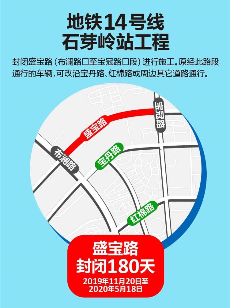 2019年11月20日至2020年5月18日共180天,封閉盛寶路(布瀾路口至寶冠路口段)進行施工。原經此路段通行的車輛,可改沿寶丹路、紅棉路或周邊其它道路通行。