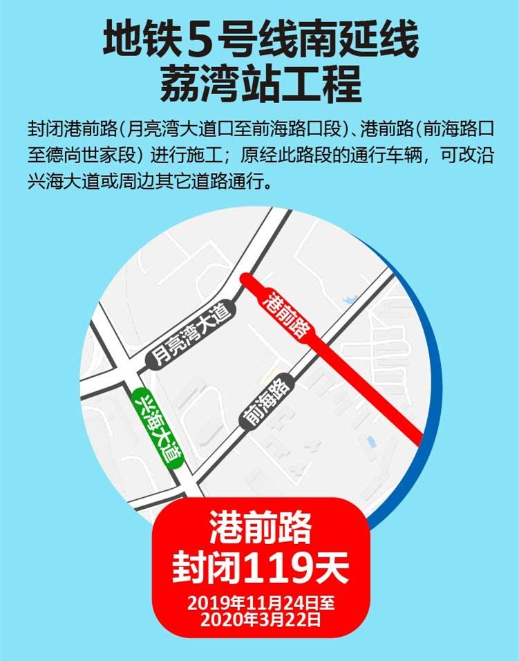 2019年11月24日至2020年3月22日共119天,封閉港前路(月亮灣大道口至前海路口段)、港前路(前海路口至德尚世家段)進行施工;原經此路段的通行車輛,可改沿興海大道或周邊其它道路通行。