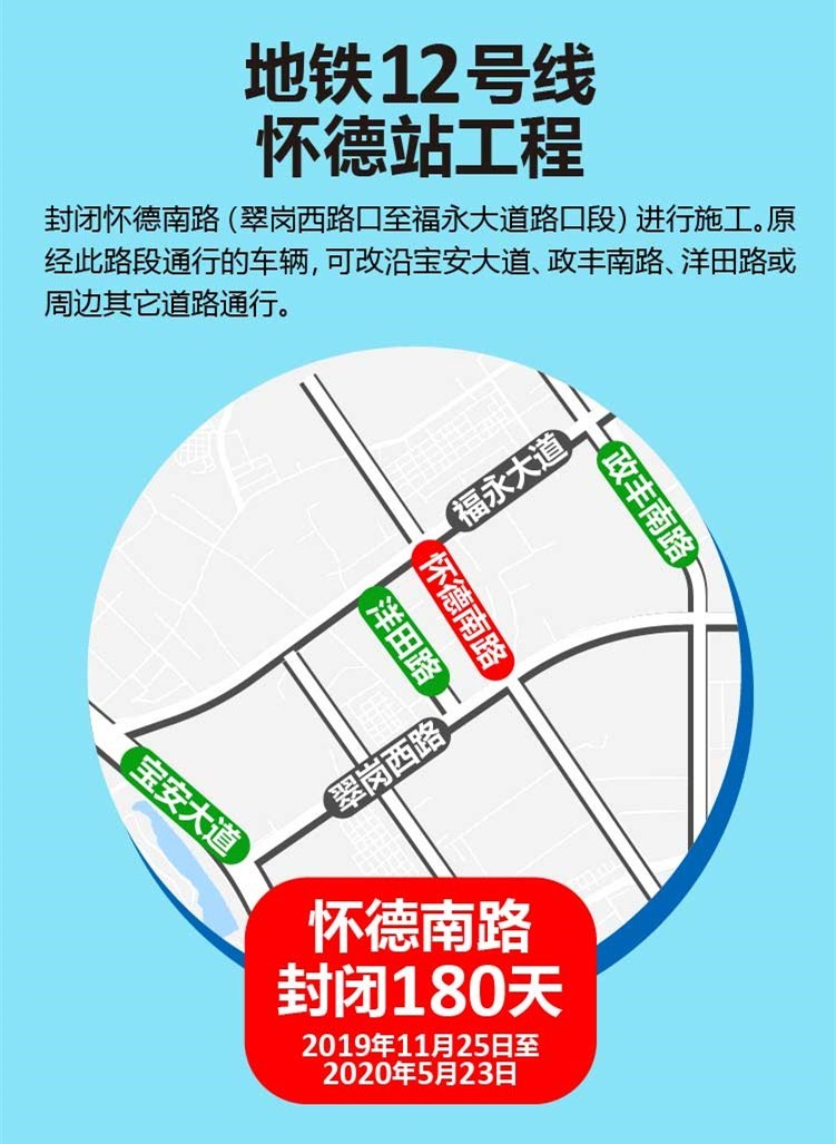 2019年11月25日至2020年5月23日共180天,封閉懷德南路(翠崗西路口至福永大道路口段)進行施工。原經此路段通行的車輛,可改沿寶安大道、政豐南路、洋田路或周邊其它道路通行。
