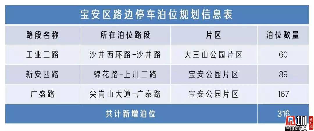 根據規劃方案,市交通運輸局擬在寶安區3條道路新增316個宜停車泊位;龍崗區23條道路上新增890個宜停車泊位;龍華區14條道路新增702個宜停車泊位、光明區9條道路新增305個宜停車泊位、大鵬新區5條道路新增157個宜停車泊位。