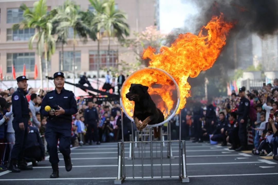 實戰撲咬、解救人質、跳火圈……警犬強悍威猛、敏銳靈動,成為了比武展示活動上的焦點。拳術表演動作利落瀟灑,孔武有力,展現著福田警察的精神風貌,市民朋友贊嘆不已。