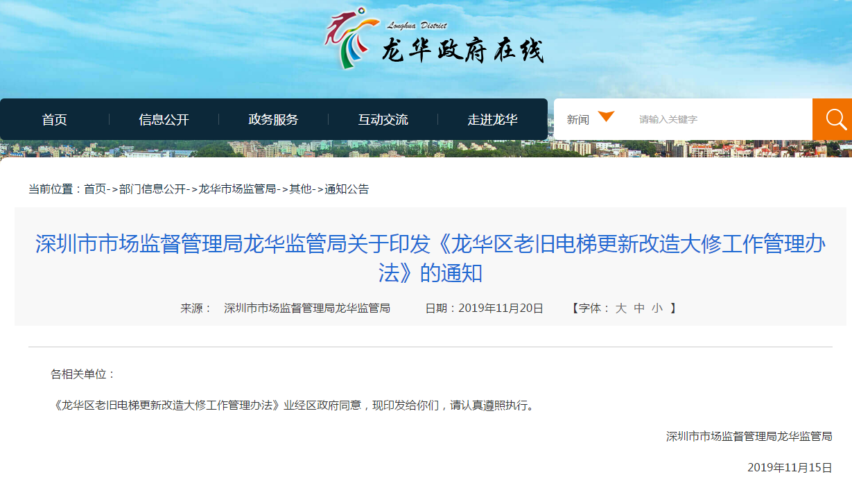 老舊電梯更新每臺補貼最高20萬!符合條件的單位可向深圳市市場監督管理局龍華監管局聯系報名,報名截止時間為:2019年12月13日。