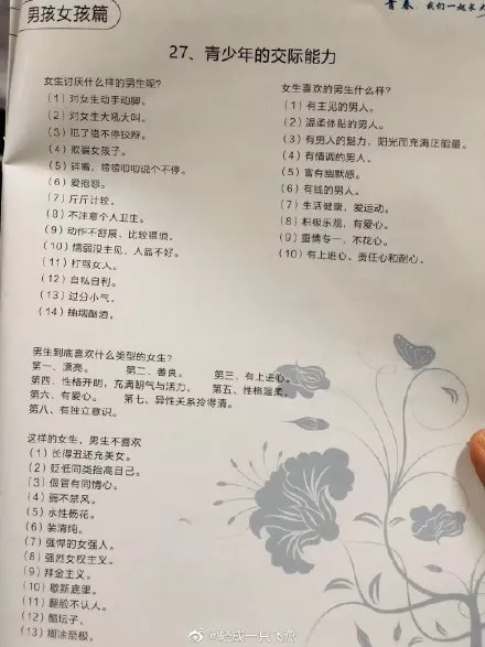 中國新聞網2019年12月6日訊 有網友舉報稱,深圳市龍華區發放的《中小學青春期心理生理衛生常識手冊》中存在性別歧視等問題,有“這樣的女生,男生不喜歡”,“女生喜歡的男生什么樣?(6):有錢”,“男生不喜歡的女生什么樣?(9):拜金”等種種不當表述。12月5日,深圳市龍華區教育局回應稱,已立即停止該項目,同時安排收回所有已下發的資料冊。
