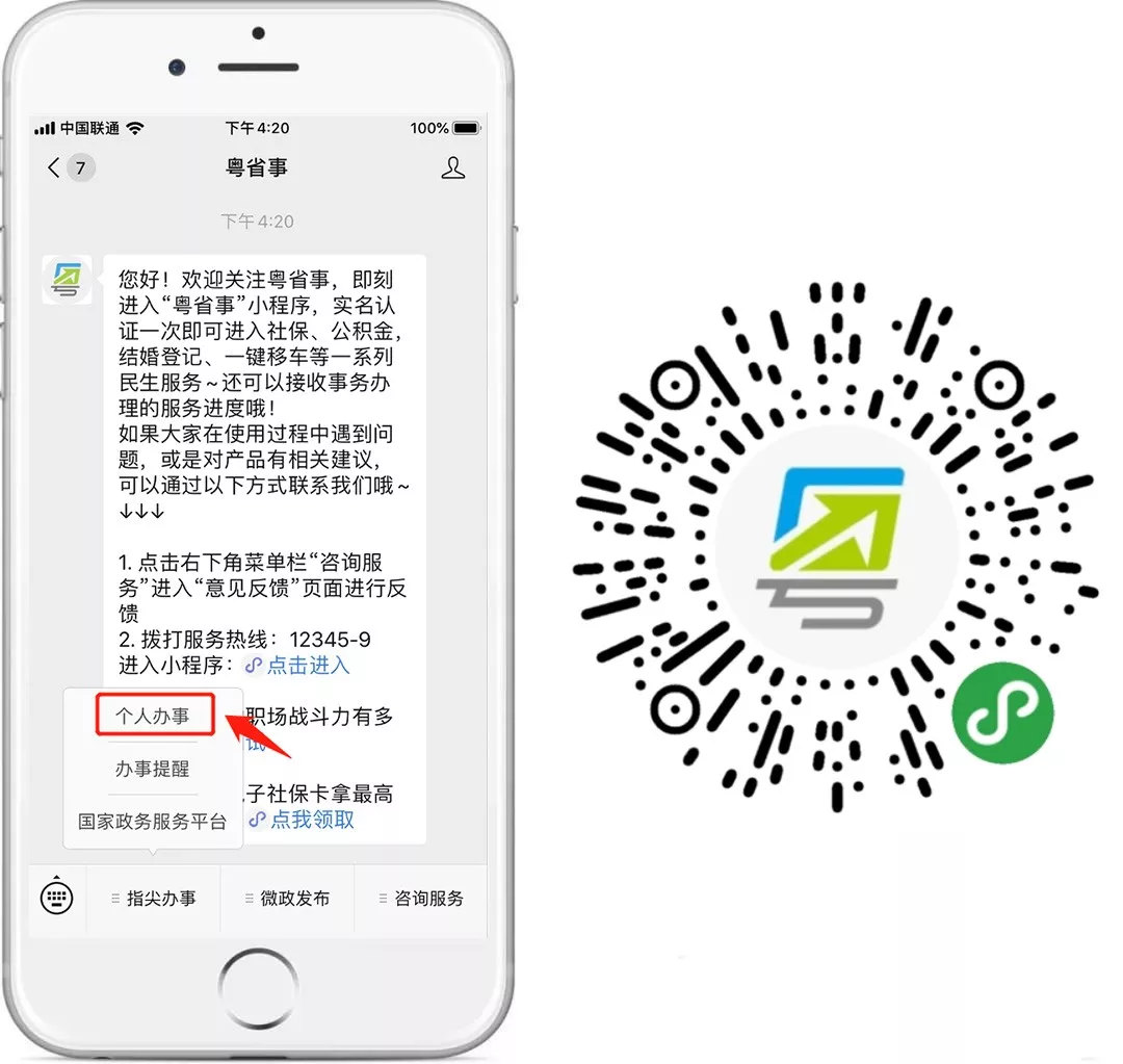微信搜索并關(guān)注“粵省事”公眾號(hào),點(diǎn)擊菜單欄“指尖辦事”—“個(gè)人辦事”進(jìn)入“粵省事”小程序,或長按識(shí)別右側(cè)葵花碼進(jìn)入小程序。