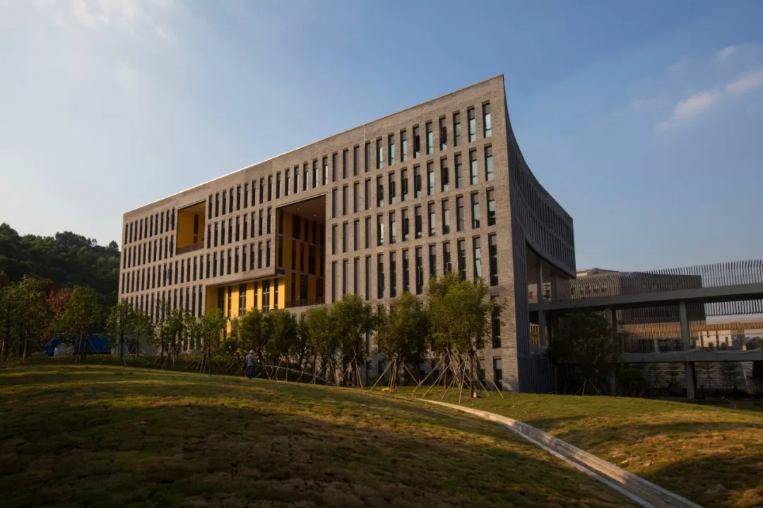 校園建筑群落依山就勢,外立面以“白墻”“格柵”為設計主要素,觀之簡潔舒展;公共空間流暢連續,與自然環境融為一體。