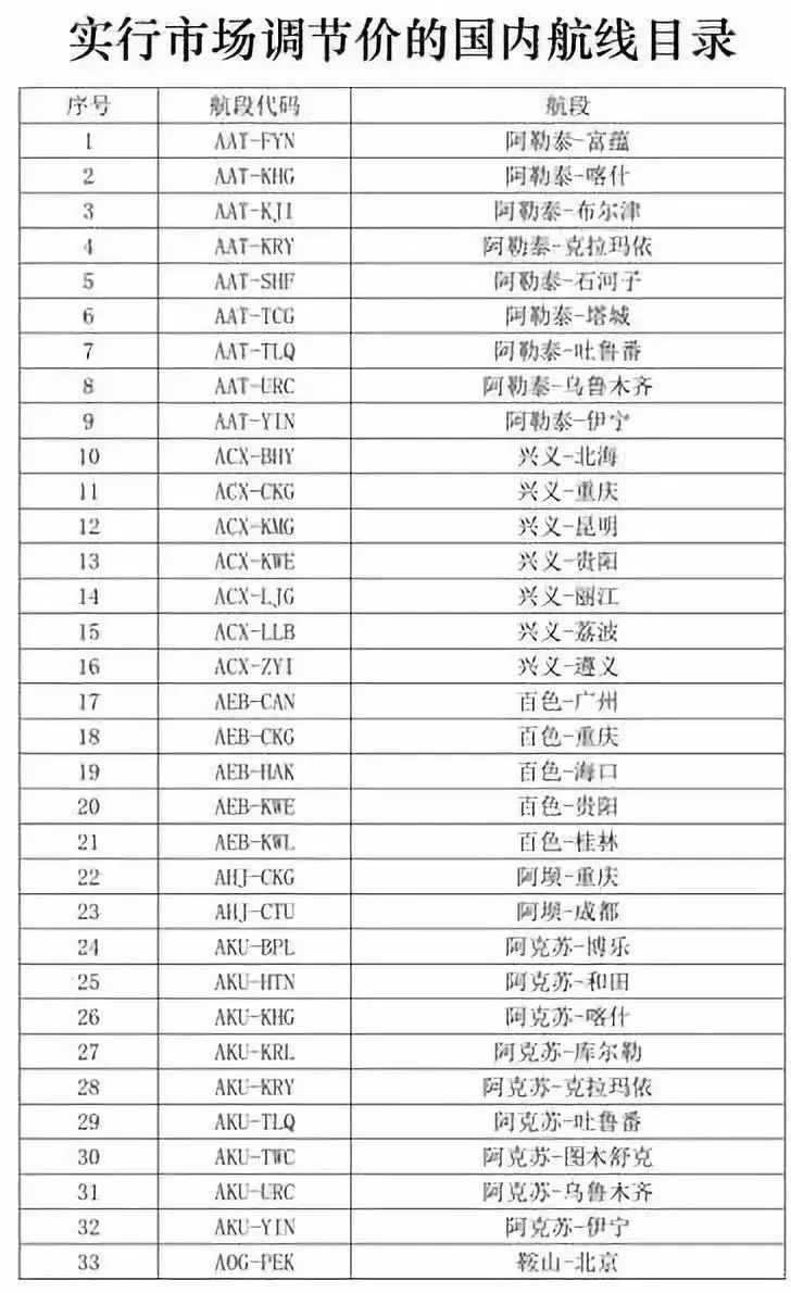 民航局最新《實行市場調節價的國內航線目錄》部分截圖