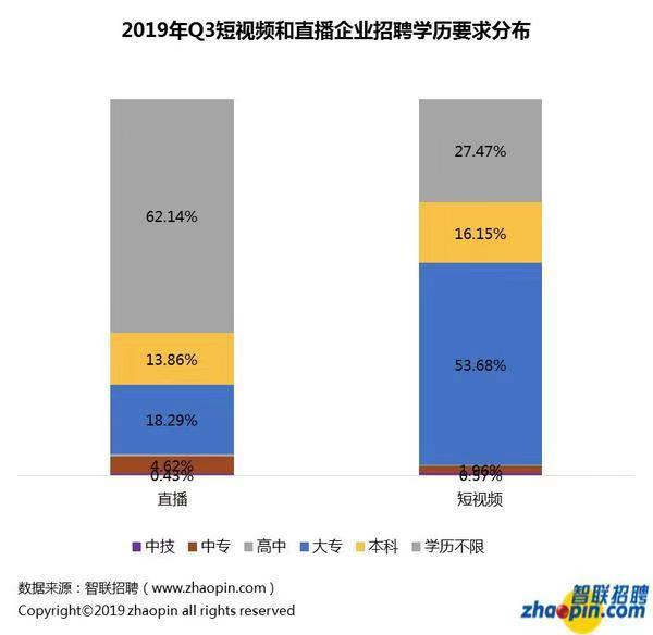 短視頻相關(guān)崗位對內(nèi)容創(chuàng)意、視頻編輯等知識和技能的要求更高,因此對人才素質(zhì)要求也更高。2019年三季度,短視頻招聘職位中,53.68%的職位要求大專學(xué)歷,16.15%的職位要求本科學(xué)歷,直播領(lǐng)域的這兩個比例分別為18.29%和13.86%,卻有62.14%的崗位不限學(xué)歷。