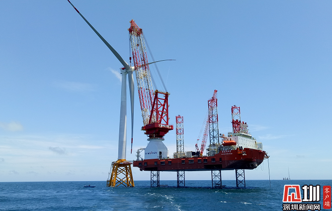 2019年6月27日,中廣核陽江南鵬島海上風(fēng)電首臺(tái)風(fēng)機(jī)完成吊裝。