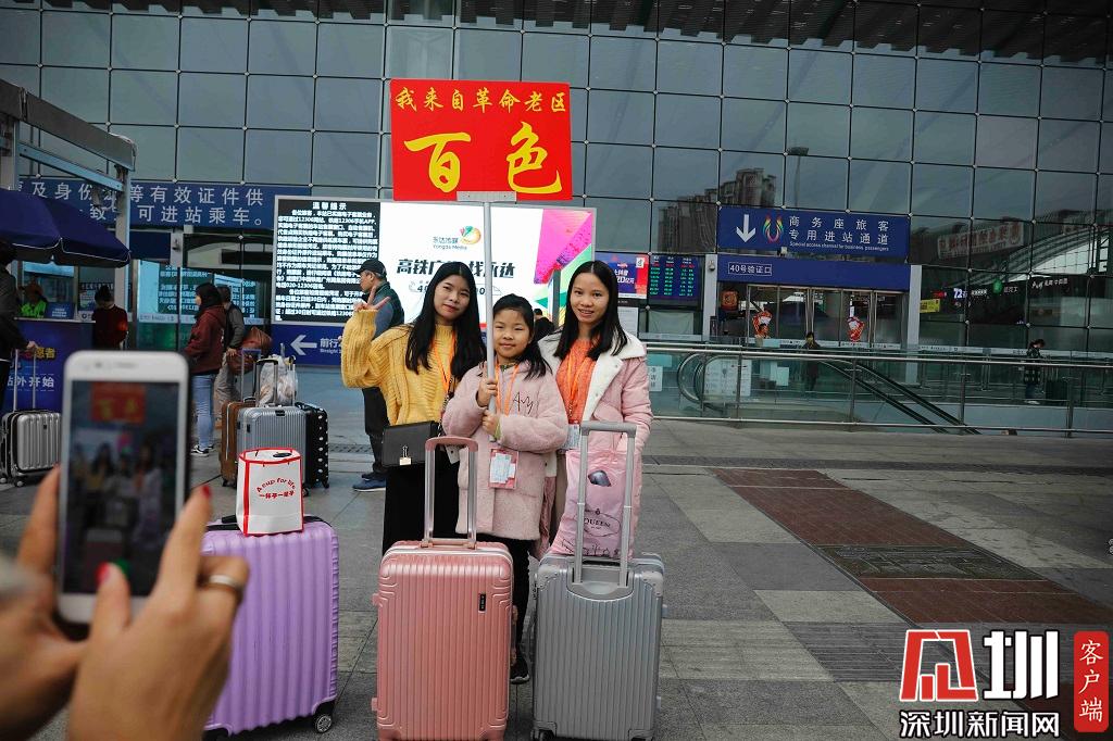 深圳北站西廣場進站口,三位搭乘本次愛心專列的乘客正在合影。