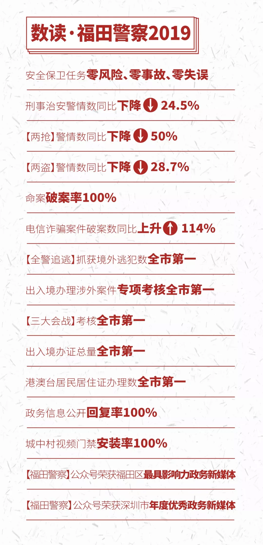 剛剛過去的2019年,是福田公安勇擔使命,砥礪奮進的一年,在市局黨委和區委區政府的堅強領導下,福田公安穩中求進、攻堅克難,穩妥應對化解系列重大風險,有效護航中心城區社會政治穩定,打贏新中國成立70周年大慶安保和澳門回歸20周年慶典安保攻堅戰,各項重大安保活動“零風險、零事故、零失誤”;強力推進掃黑除惡、“颶風2019”等一系列專項行動,合成打擊效能突顯;持續推動現代化警務機制變革,改革攻堅蹄疾步穩;提升社會治安基礎治理工作,治安面貌持續向好;隊伍建設舉措剛柔相濟,錘煉“四個鐵一般”的過硬警隊。
