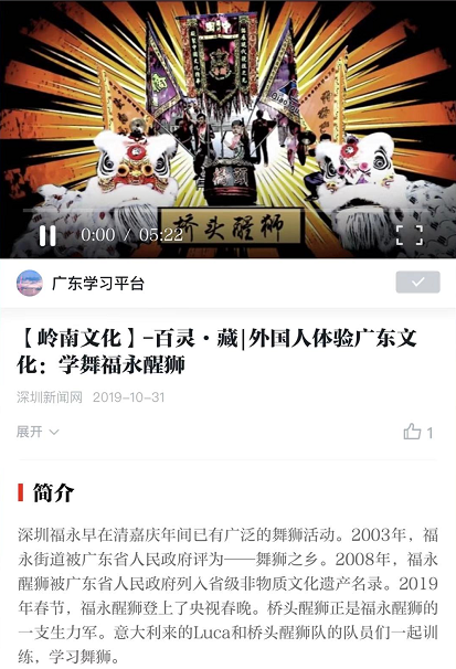 作品鏈接:IN視頻|外國(guó)人體驗(yàn)廣東文化:學(xué)舞福海醒獅
