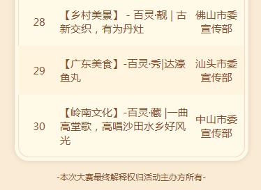 據(jù)了解,為慶祝新中國(guó)成立70周年,生動(dòng)展示黨的十八大以來(lái),廣東高舉習(xí)近平新時(shí)代中國(guó)特色社會(huì)主義思想偉大旗幟、深入推進(jìn)美麗鄉(xiāng)村建設(shè)的豐碩成果,廣東鄉(xiāng)村微視頻大賽于8月20日正式啟動(dòng)。本次微視頻大賽歷時(shí)2個(gè)多月,共征集參賽作品9375條,審核展示5996條。廣東學(xué)習(xí)平臺(tái)PC端和手機(jī)APP開設(shè)參賽作品展播專題。經(jīng)過網(wǎng)上展播和網(wǎng)絡(luò)投票,以及專家評(píng)審,評(píng)選出一等獎(jiǎng)30名,二等獎(jiǎng)100名,三等獎(jiǎng)1000名,以及最佳創(chuàng)意獎(jiǎng)、最佳畫面獎(jiǎng)、最佳人氣獎(jiǎng)各10名。佛山、廣州、惠州等10個(gè)地級(jí)以上市黨委宣傳部獲大賽組織獎(jiǎng)。