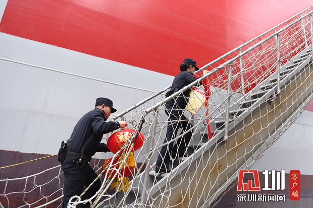 鹽田邊檢站登輪送春聯、燈籠,將中國年送上國際船舶。