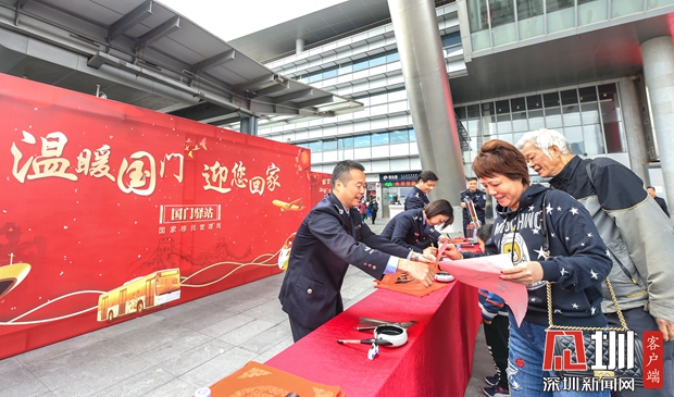 深圳灣邊檢站民警現(xiàn)場(chǎng)揮毫潑墨寫下祝福。
