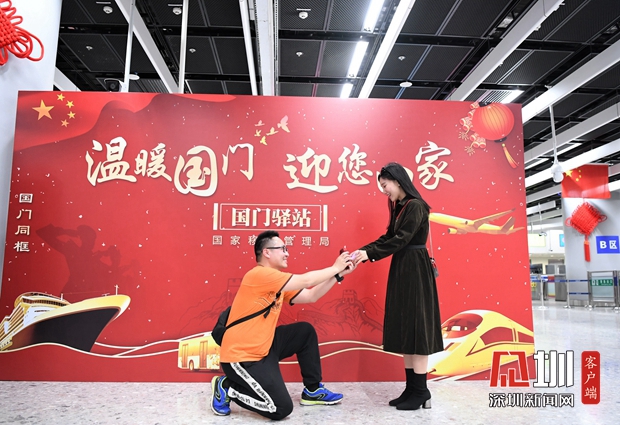 1月20日,西九龍邊檢站“國門驛站”展板前,在邊檢民警的掌聲和祝福中,旅客官先生鄭重向女友宋女士求婚,有情人終成眷屬,“在國門求婚,把愛人帶回家門”成為一段佳話。為營造溫馨喜慶的春節氛圍,該站在口岸設置主題活動展板,懸掛節日裝飾,還研發小程序,在驗證臺一體機向旅客展示主題海報,令人耳目一新。