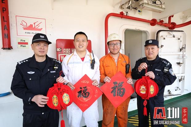 蛇口邊檢站邊檢民警登上輪船為船員送“福”。
