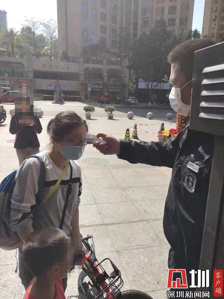 保安對進出住戶進行體溫測量。