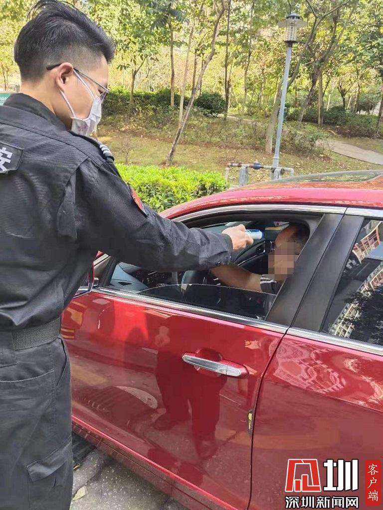 保安對進出小區車主進行體溫測量。