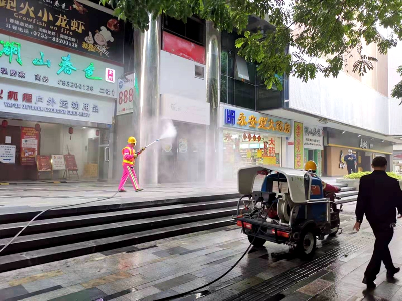 航苑大廈西座位于福田區(qū)華強北街道華航社區(qū),當天下午,記者在航苑西座看到,有兩名值班保安在門口嚴格把關,對每個進入小區(qū)的住戶進行體溫檢測。一輛灑水車正在圍繞小區(qū)噴灑消毒液。