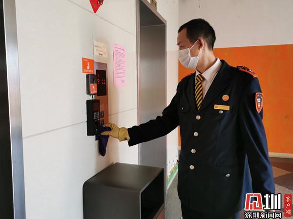 工作人員在給電梯消毒。
