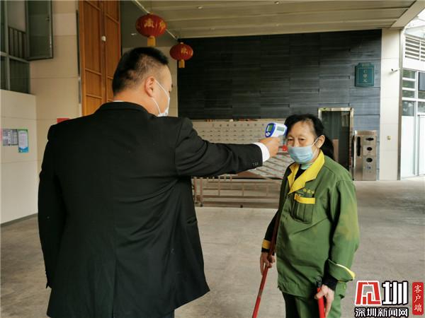 物業工作人員正在給保潔員測溫。