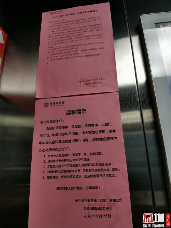 小區物業管理處主任鄒菊彬表示,目前小區每天進行3次全面消殺,包括地面、電梯、樓道等多個位置。他表示,小區內已張貼《新型冠狀病毒感染的肺炎相關知識和個人防護》等防護指引和宣傳資料。物業工作人員向還未返深的住戶進行了宣傳解釋,消除恐慌。對返深的小區住戶已做好詳細信息登記,對居家醫學觀察的住戶每天兩次隨訪,并經常給他們送一些生活用品。“我們的工作人員已經把電話留給他們,有啥需要幫忙的可以隨時聯系”,他說到。
