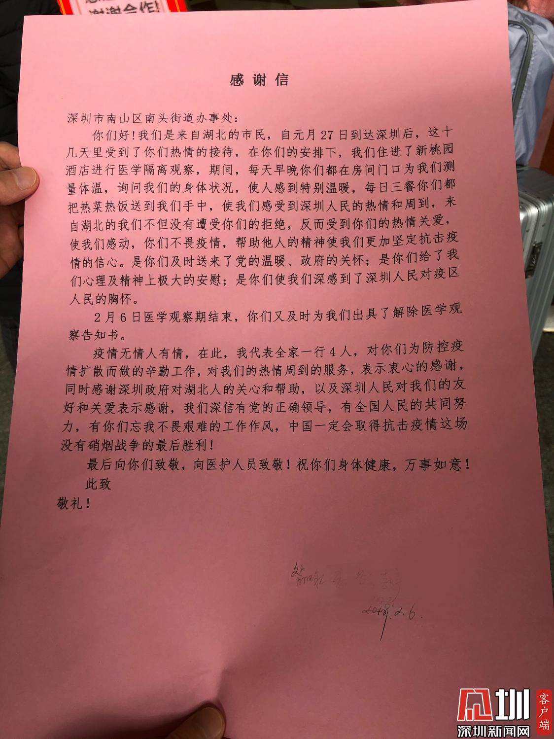 2月6日醫(yī)學(xué)觀察期滿,經(jīng)檢測他們一家并無不適癥狀,衛(wèi)健局駐點(diǎn)人員為其出具了解除醫(yī)學(xué)觀察告知書。李女士拉著行李滿眼淚花說道:“深圳各級政府部門高效實(shí)干,深圳的工作人員很熱心很細(xì)心,疫情猖獗時(shí),人間自有真情在,真的感謝你們。”