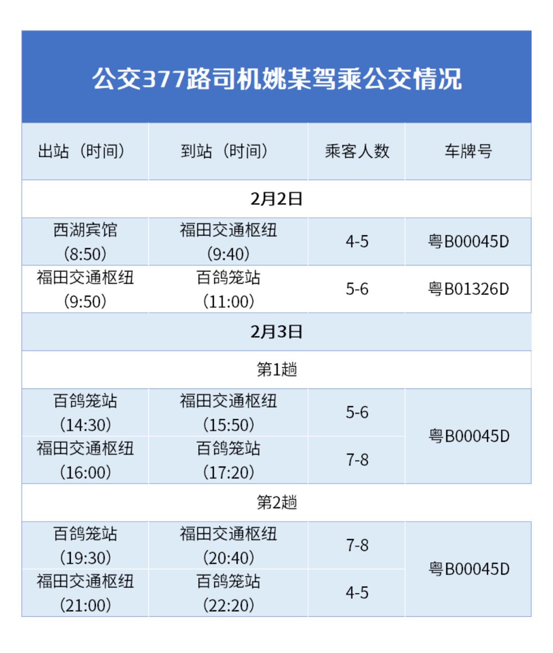 根據姚某的行車記錄,2月2日早上8時50分,他隨377路跟班一趟,從西湖賓館站至福田交通樞紐,又從該站換車至百鴿籠站,每一輛公交車的乘客人數為4-6人。跟班時,姚某多數時間坐在公交車中后部,并佩戴口罩。