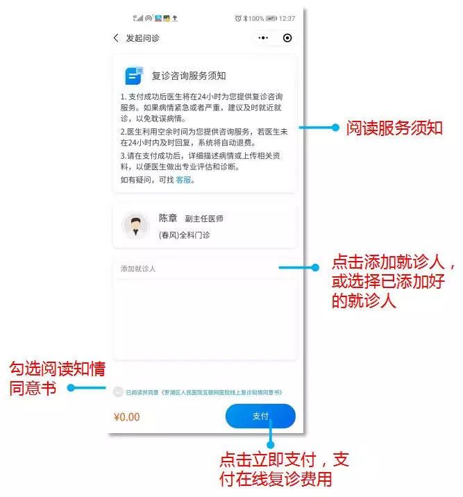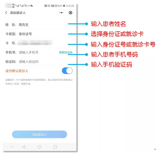 患者首次進入診室,需添加就診人,輸入在醫院的就診信息,綁定身份。