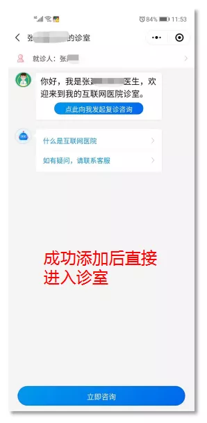 方式二:亦可通過直接掃描醫生二維碼,添加就診人后可以在診室向醫生發起問診咨詢
