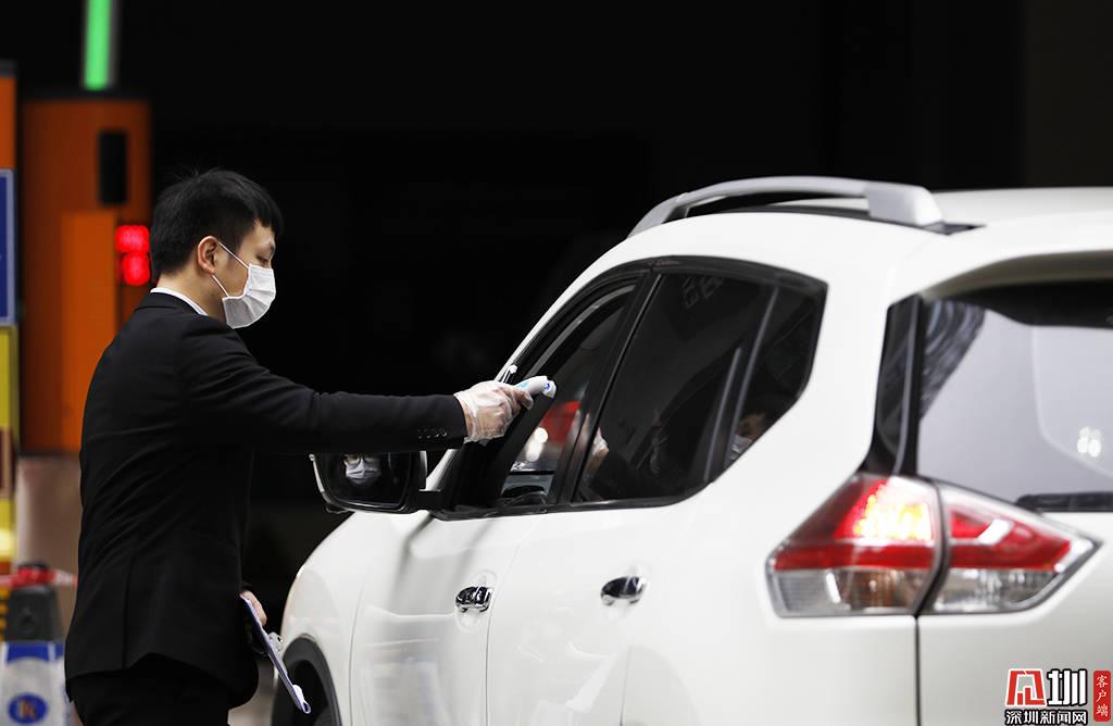深圳軟件產(chǎn)業(yè)基地的一個(gè)停車(chē)場(chǎng)入口,一位工作人員正在為入場(chǎng)的司機(jī)測(cè)體溫。