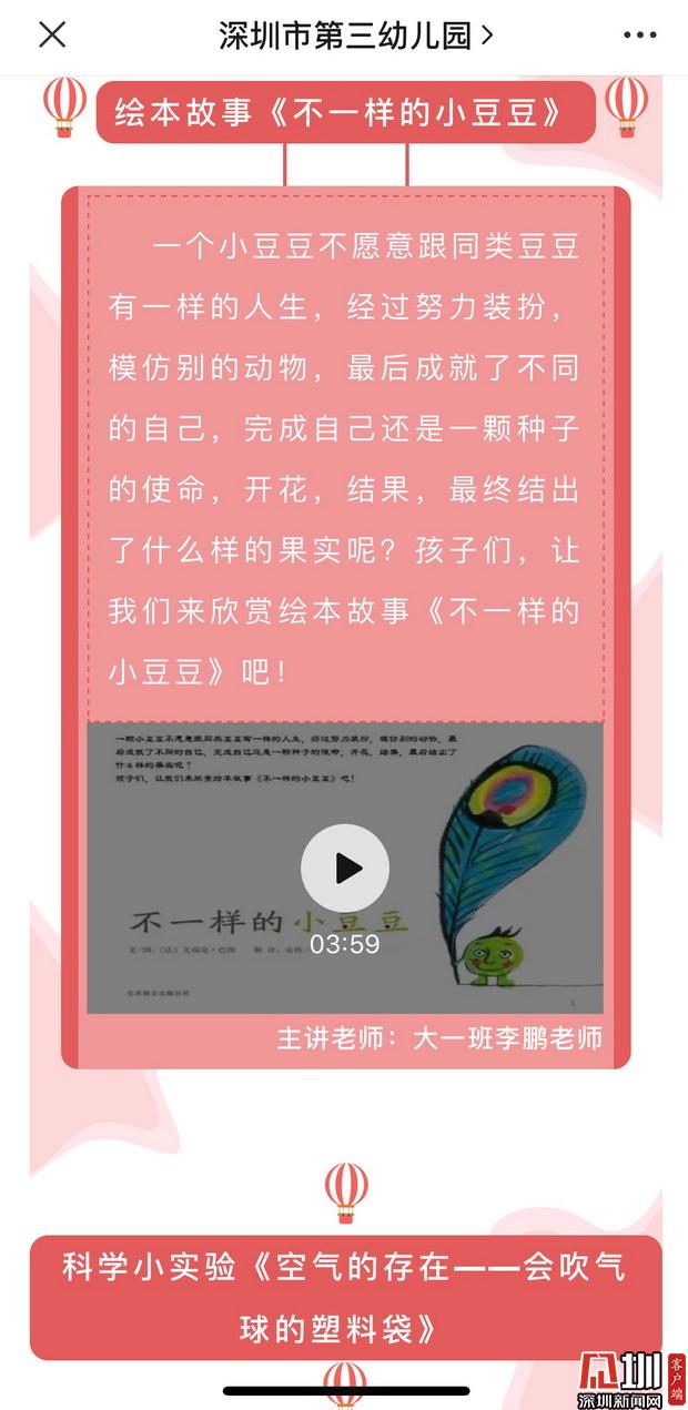 深圳市第三幼兒園園長邱雪華訴記者:“目前,三幼已經開啟線上教學活動,我們充分運用公眾號、微信群等網絡平臺,與家長、幼兒充分互動,陸續推出具有健康促進特色的圖文推送,其中包括介紹防疫常識的攻略、由園長主講的園長電臺,還創辦了每日一期的原創系列游戲,以便家長在家也能獲取適宜的親子游戲活動資源?!庇浾咴谏钲谑械谌變簣@的微信公眾平臺上看到,幼兒園線上互動內容豐富,其中包括視頻繪本故事、科學小實驗以及親子體育游戲。每個版塊均由深圳市第三幼兒園老師們主講示范并錄制視頻,便于孩子及家長學習。