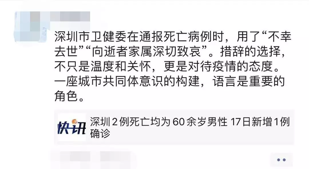 深圳市衛健委在通報死亡病例時,用了“不幸去世”“向逝者家屬深切致哀”。措辭的選擇,不只是溫度和關懷,更是對待疫情的態度。