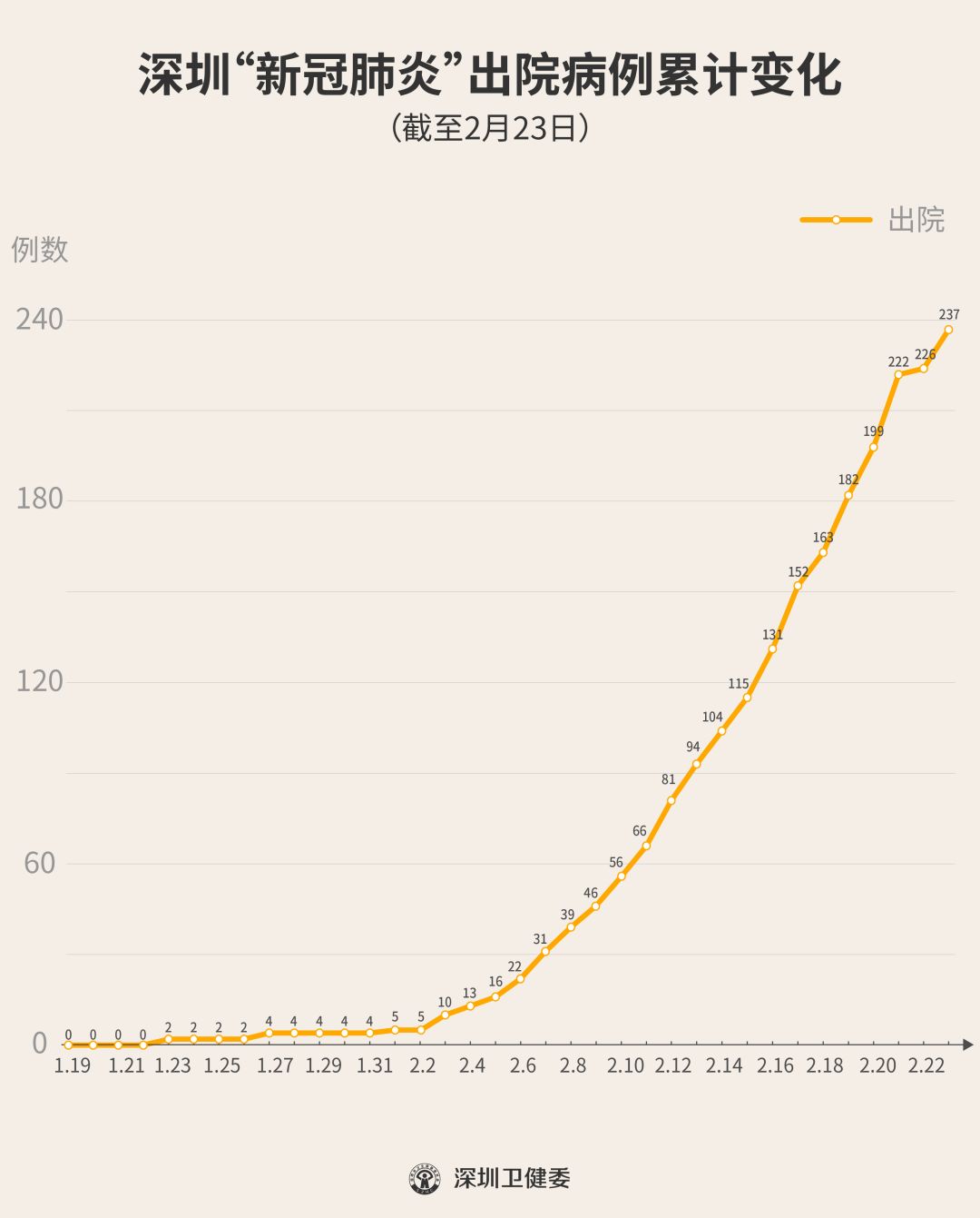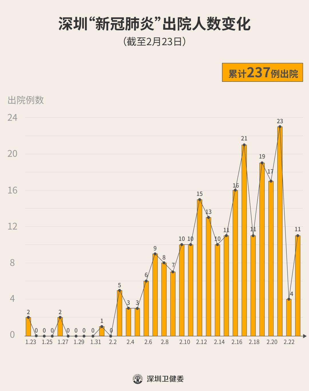 2月23日下午,經專家組會診,深圳有11名新型冠狀病毒肺炎確診患者出院,累計達237人,連續21天有人出院。