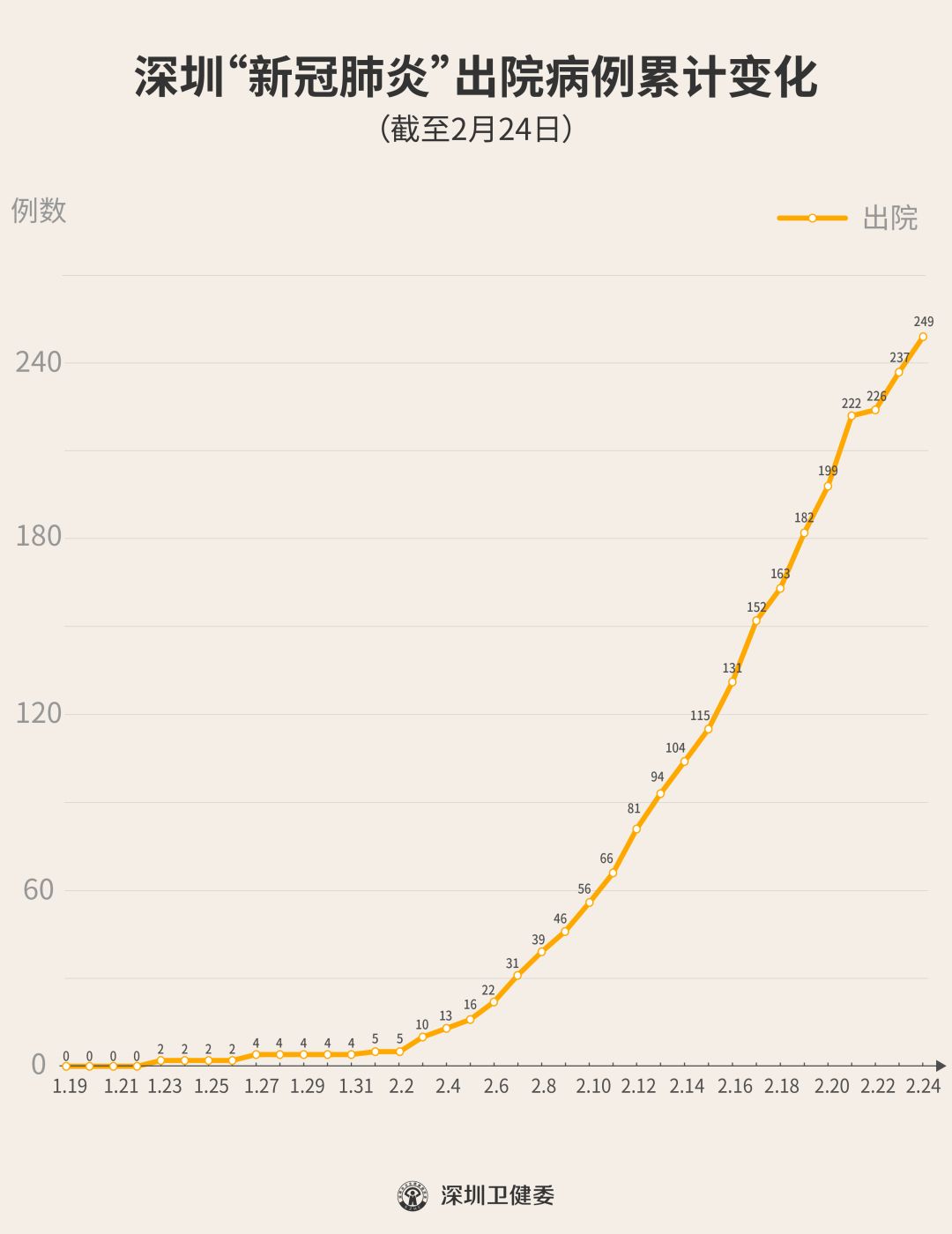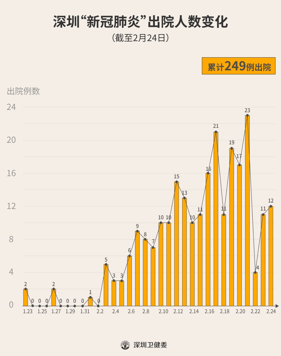 2月24日下午,經專家組會診,深圳有12名新型冠狀病毒肺炎確診患者出院,累計達249人,連續22天有人出院。
