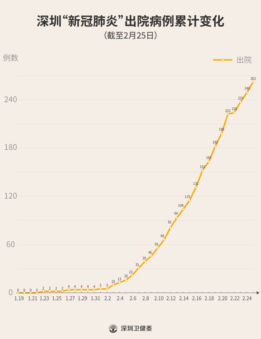2月25日下午,經專家組會診,深圳有13名新型冠狀病毒肺炎確診患者出院,累計達262人,連續23天有人出院。