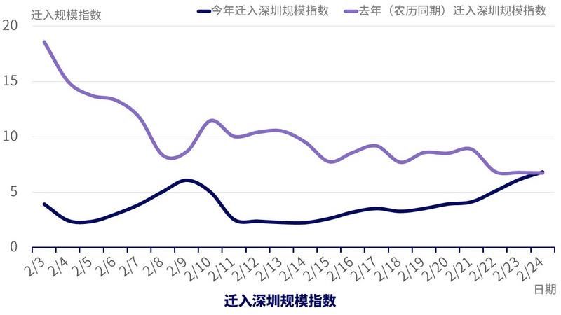 從百度遷徙地圖看到,2月21日起,深圳已連續4天居全國熱門遷入地榜首,同時,遷入規模指數也逐漸接近去年農歷同期水平。