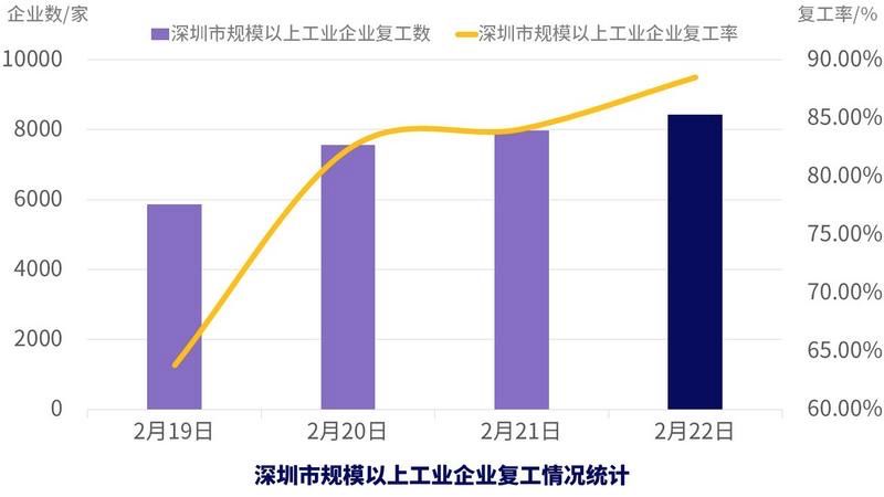 2月20日,深圳單日復工企業數超1萬6千家,較前一天增長23%,規模以上企業復工數也增長了近30%。2月21日,全市累計復工企業超10萬家,增速近20%,同時,全市規模以上企業復工率超80%。2月22日,復工企業單日再添1萬多家,全市企業復工快速有序地進行中。