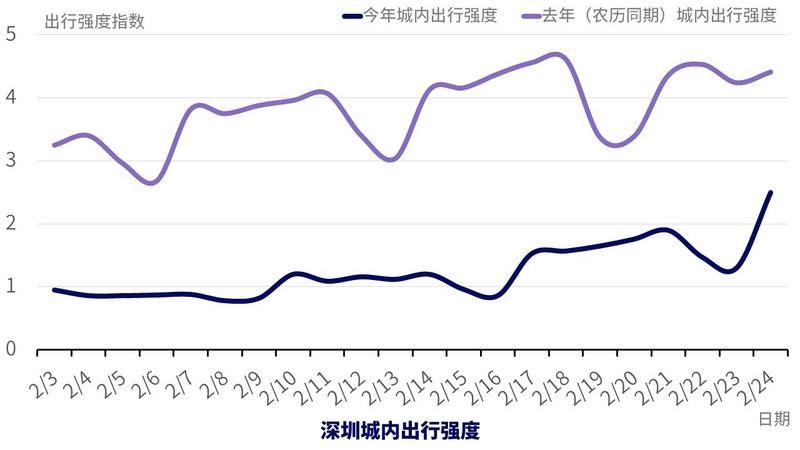 人員的遷入,復工的進行時,讓深圳久違的早高峰再次出現,2月24日,深圳早高峰時段出行車輛42.09萬輛,較上一周上升58%,城內出行強度達去年農歷同期的56.7%。