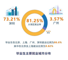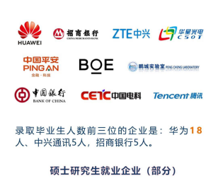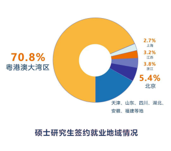 而在碩士研究生的就業數據方面,碩士研究生就業率達98.8%,四分之三的同學選擇了簽約就業。錄取畢業生最多的企業分別是華為、中興、招商銀行,大多數畢業生都留在了粵港澳大灣區。