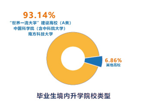 而境內升學中,去往雙一流高校以及中國科學院(含中科院大學)、南科大的畢業生占了絕大部分。其中,到清華大學和北京大學升學的共計13人,7人攻讀碩士學位,6人攻讀博士學位。