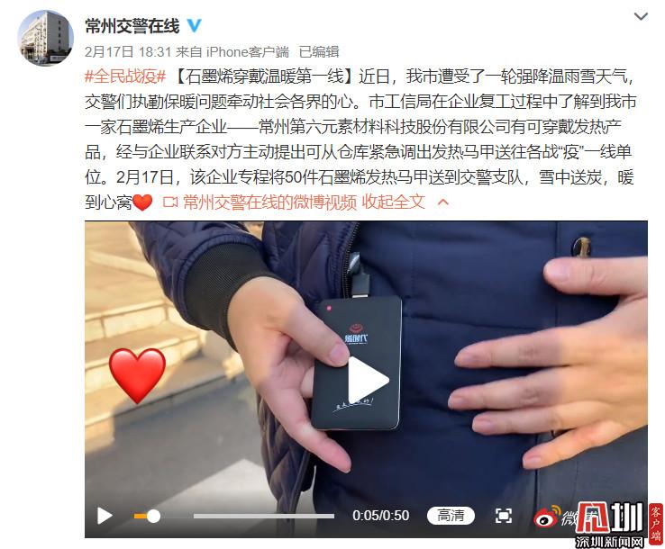2月18日,一場大雪降臨常州,風大雪大溫度低,常州各單位一線工作者堅守崗位,一如既往地扎實做好疫情防控工作。烯旺科技聯合兄弟企業常州第六元素向奮斗中在抗疫中執勤一線的常州交警支隊,惠山區公安局、惠山經濟開發區執勤人員捐贈共計160件純石墨烯發熱馬甲,價值23.7萬元,以此向一線工作者送去溫暖,并致以崇高的敬意。