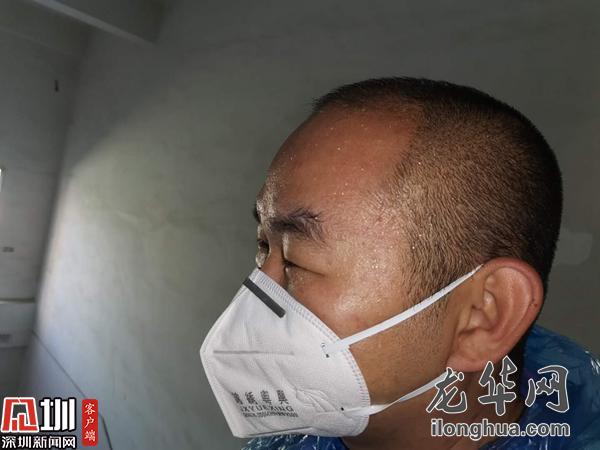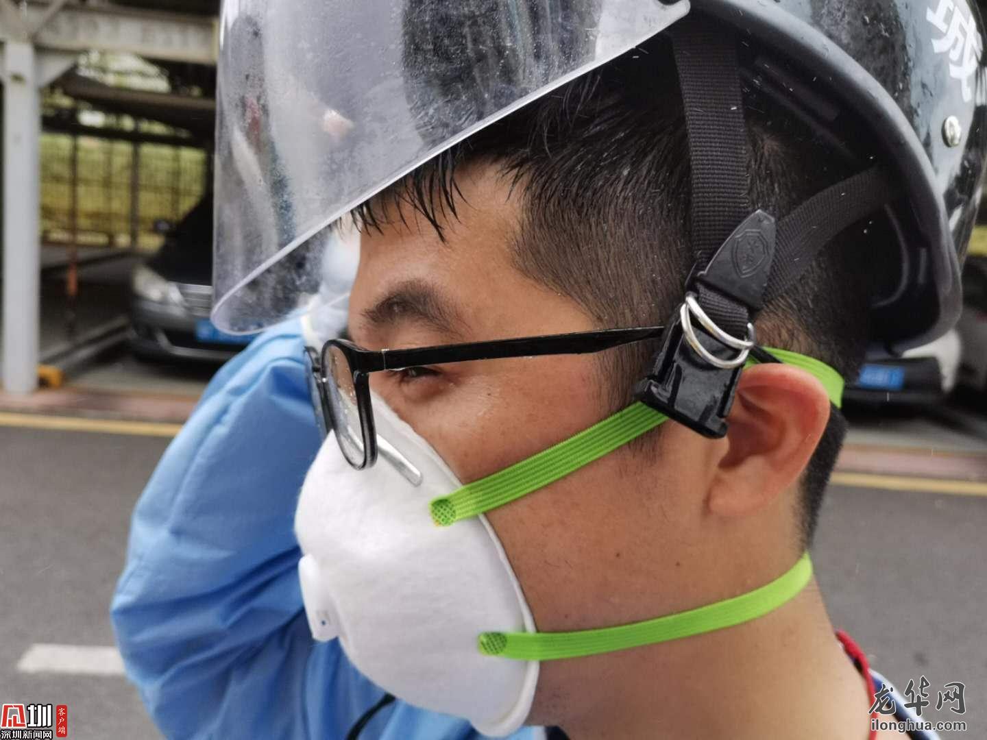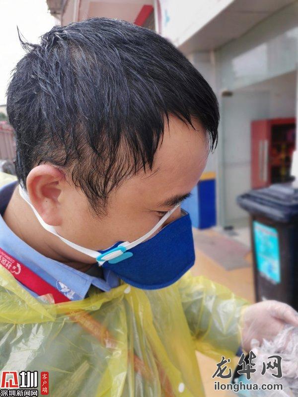 接到有返深人員的通知,他立刻帶隊趕往現(xiàn)場,多次測溫后仍體溫偏高,他不放心地叫來三位一體人員,一番確認(rèn)之后,將發(fā)熱人員送往醫(yī)院,他則獨自善后對樓道進行消毒,將近兩個小時的折騰,他終于得以到垃圾桶旁邊喘口氣。額頭勒出的印痕和黏在后背的制服,都是每一天的勛章。